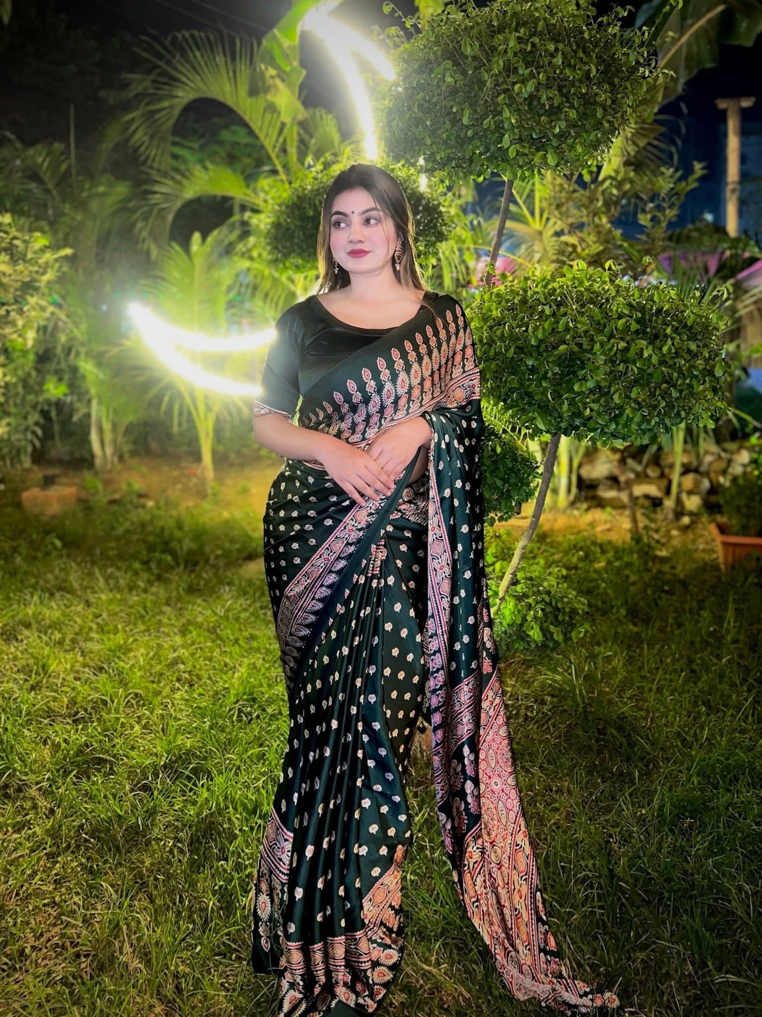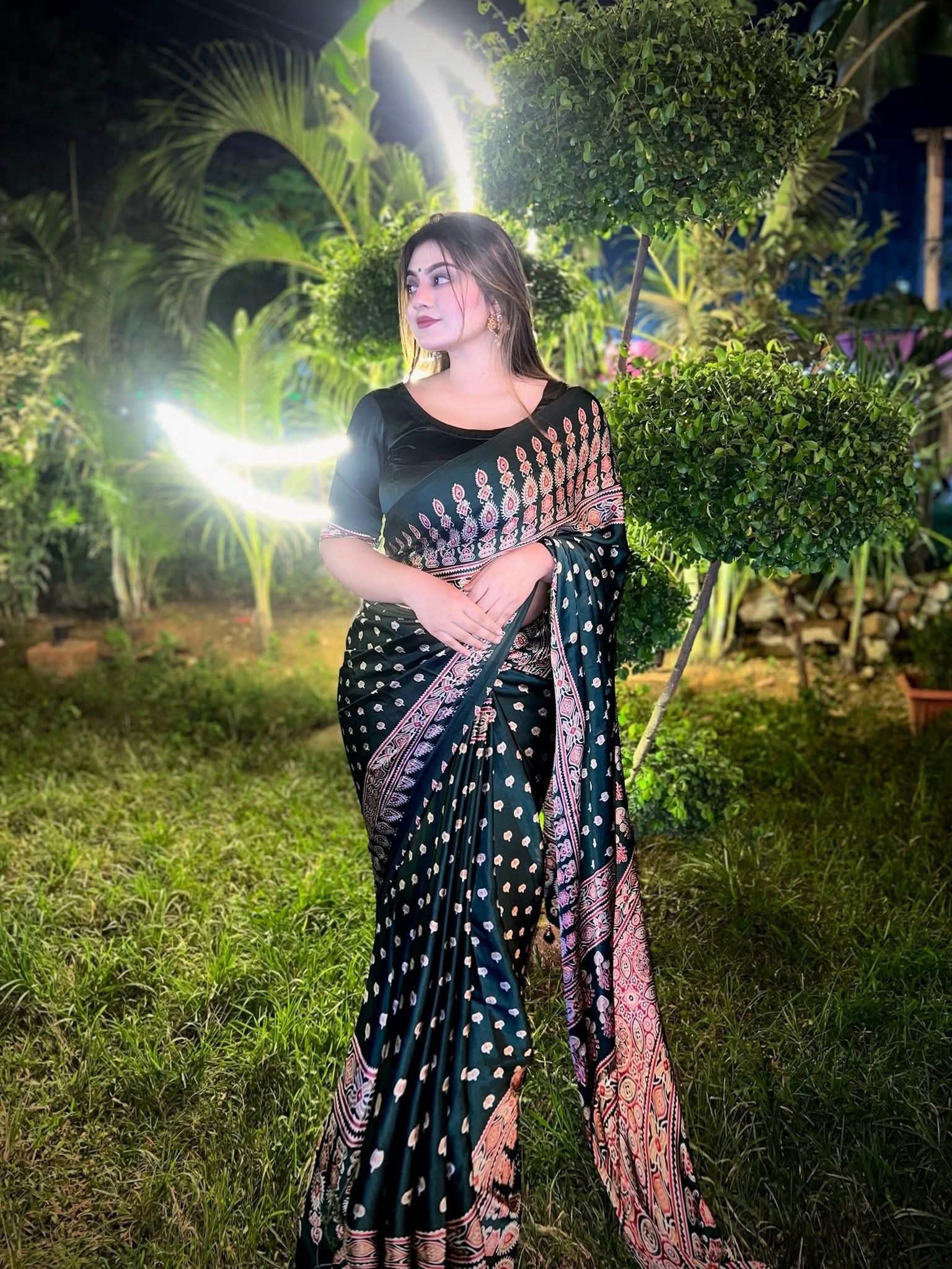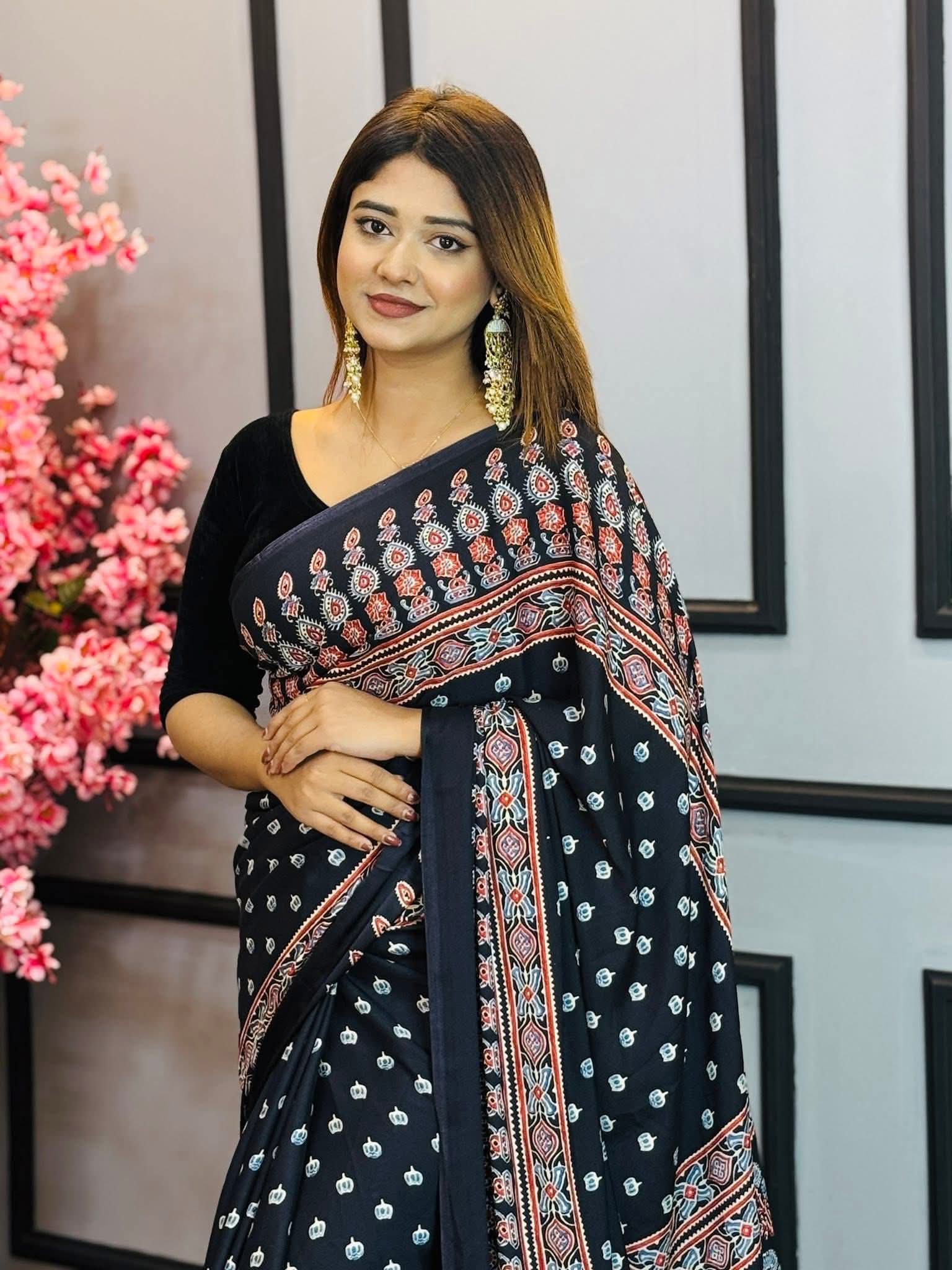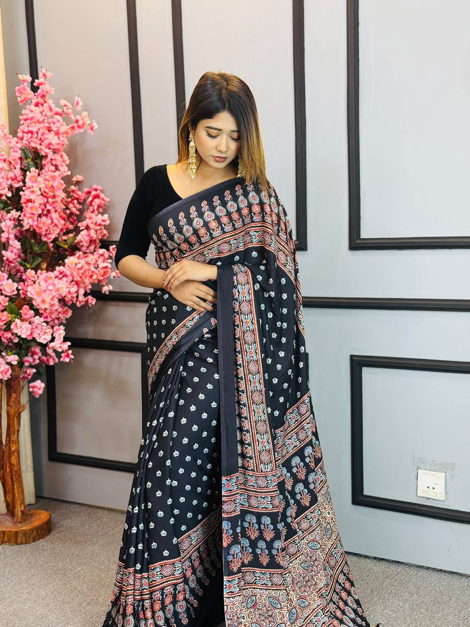 Pure Indian Ajrak modal silk saree featuring elegant printed work detailing. Comes with a matching unstitched blouse piece attached with the saree.