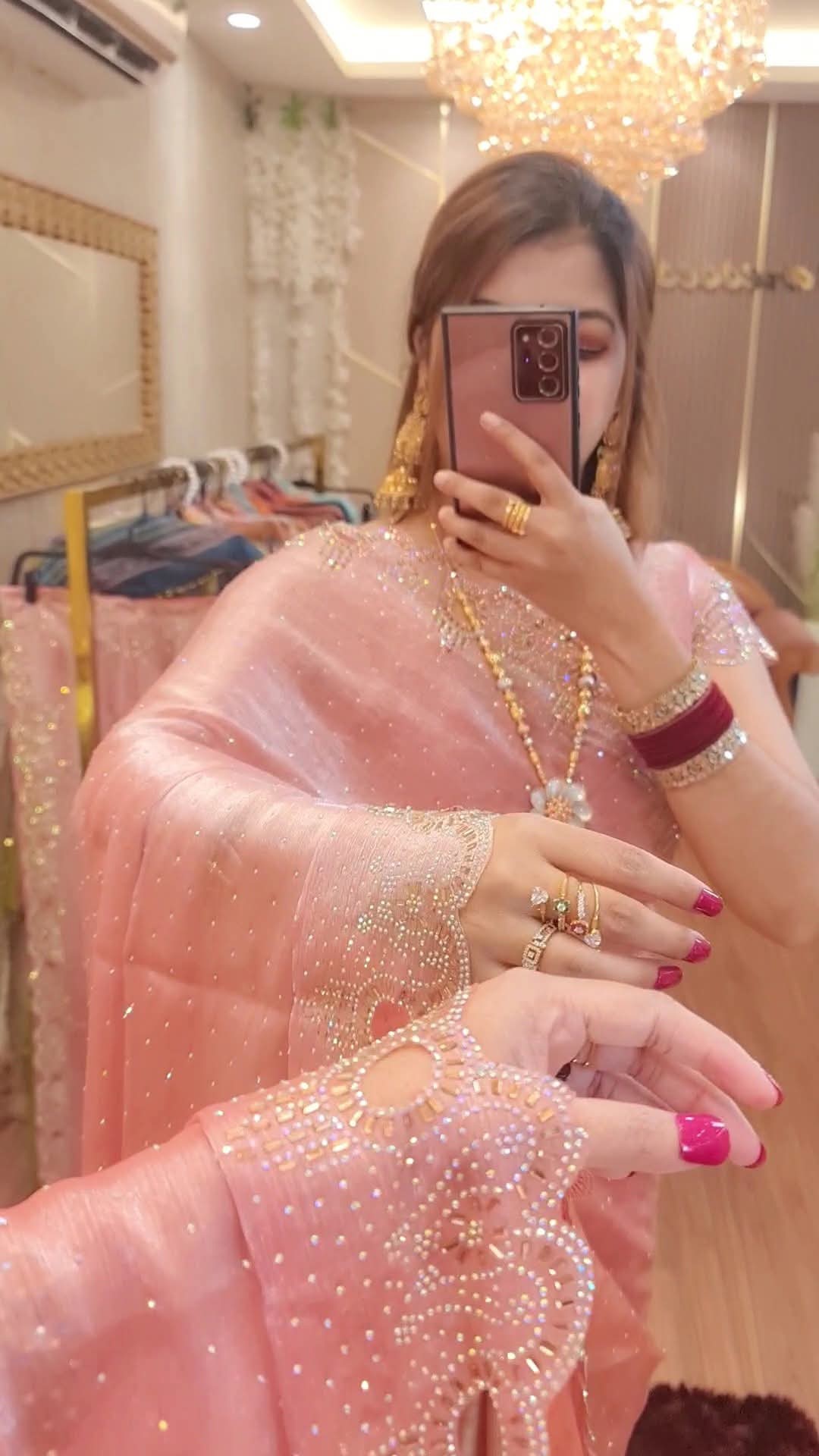 Gemichu georgette saree featuring laser cut detailing and stone work. Comes with a matching unstitched blouse piece attached with the saree.