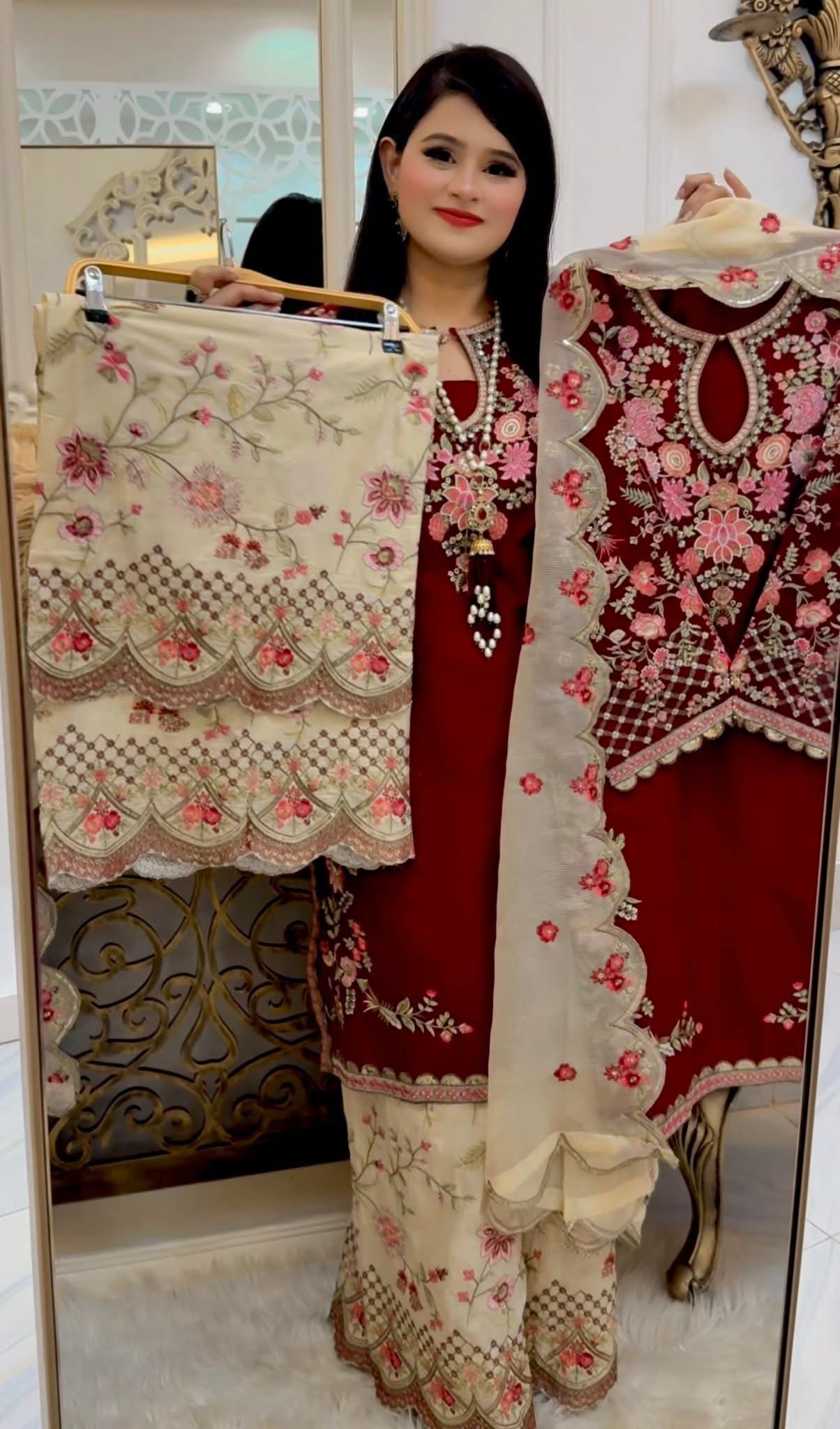 ফুল এমব্রয়ডারি কাজ করা কটন থ্রি পিস – এবার আপনার স্টাইল হবে একদম এলিগেন্ট 💫